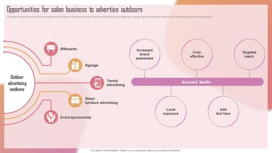 This slide presents the key outdoor advertising opportunities for the salon business. It includes mediums such as billboards, signage, transit advertising, street furniture advertising, and event sponsorship. Present like a pro with Customizing The Salon Experience Opportunities For Salon Business To Advertise Outdoors Strategy SS V. Create beautiful presentations together with your team, using our easy-to-use presentation slides. Share your ideas in real-time and make changes on the fly by downloading our templates. So whether you are in the office, on the go, or in a remote location, you can stay in sync with your team and present your ideas with confidence. With Slidegeeks presentation got a whole lot easier. Grab these presentations today. This slide presents the key outdoor advertising opportunities for the salon business. It includes mediums such as billboards, signage, transit advertising, street furniture advertising, and event sponsorship.