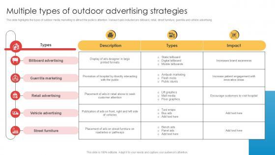 This slide highlights the types of outdoor media marketing to attract the publics attention. Various types included are billboard, retail, street furniture, guerrilla and vehicle advertising. There are so many reasons you need a Multiple Types Of Outdoor Advertising Strategies Implementation Of Online Ppt Sample. The first reason is you can not spend time making everything from scratch, Thus, Slidegeeks has made presentation templates for you too. You can easily download these templates from our website easily. This slide highlights the types of outdoor media marketing to attract the publics attention. Various types included are billboard, retail, street furniture, guerrilla and vehicle advertising.