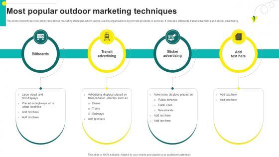 This slide shows three most preferred outdoor marketing strategies which can be used by organizations to promote products or services. It includes billboards, transit advertising and sticker advertising. The One On One Advertising Most Popular Outdoor Marketing Techniques Strategy SS V is a compilation of the most recent design trends as a series of slides. It is suitable for any subject or industry presentation, containing attractive visuals and photo spots for businesses to clearly express their messages. This template contains a variety of slides for the user to input data, such as structures to contrast two elements, bullet points, and slides for written information. Slidegeeks is prepared to create an impression. This slide shows three most preferred outdoor marketing strategies which can be used by organizations to promote products or services. It includes billboards, transit advertising and sticker advertising.