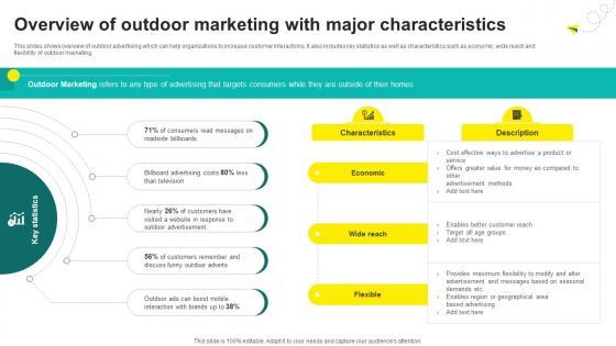 This slides shows overview of outdoor advertising which can help organizations to increase customer interactions. It also includes key statistics as well as characteristics such as economic, wide reach and flexibility of outdoor marketing. Boost your pitch with our creative One On One Advertising Overview Of Outdoor Marketing With Major Characteristics Strategy SS V. Deliver an awe-inspiring pitch that will mesmerize everyone. Using these presentation templates you will surely catch everyones attention. You can browse the ppts collection on our website. We have researchers who are experts at creating the right content for the templates. So you do not have to invest time in any additional work. Just grab the template now and use them. This slides shows overview of outdoor advertising which can help organizations to increase customer interactions. It also includes key statistics as well as characteristics such as economic, wide reach and flexibility of outdoor marketing.