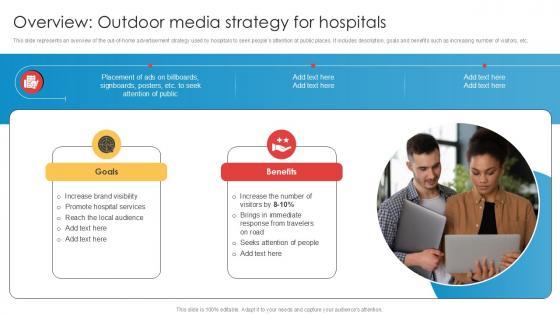 This slide represents an overview of the out of home advertisement strategy used by hospitals to seek peoples attention at public places. It includes description, goals and benefits such as increasing number of visitors, etc. Present like a pro with Overview Outdoor Media Strategy For Hospitals Implementation Of Online Ppt Sample. Create beautiful presentations together with your team, using our easy-to-use presentation slides. Share your ideas in real-time and make changes on the fly by downloading our templates. So whether you are in the office, on the go, or in a remote location, you can stay in sync with your team and present your ideas with confidence. With Slidegeeks presentation got a whole lot easier. Grab these presentations today. This slide represents an overview of the out of home advertisement strategy used by hospitals to seek peoples attention at public places. It includes description, goals and benefits such as increasing number of visitors, etc.