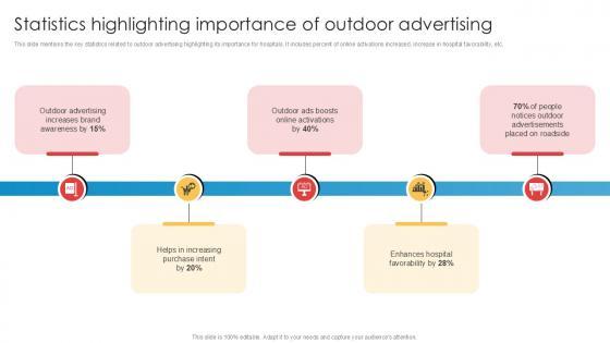 This slide mentions the key statistics related to outdoor advertising highlighting its importance for hospitals. It includes percent of online activations increased, increase in hospital favorability, etc. Make sure to capture your audiences attention in your business displays with our gratis customizable Statistics Highlighting Importance Of Outdoor Implementation Of Online Ppt Slides. These are great for business strategies, office conferences, capital raising or task suggestions. If you desire to acquire more customers for your tech business and ensure they stay satisfied, create your own sales presentation with these plain slides. This slide mentions the key statistics related to outdoor advertising highlighting its importance for hospitals. It includes percent of online activations increased, increase in hospital favorability, etc.