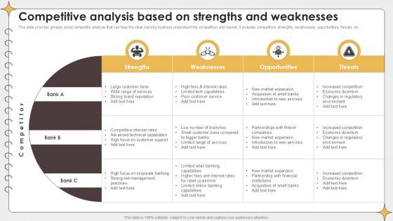 This slide provides glimpse about competitor analysis that can help the retail banking business understand the competition and market. It includes competitors, strengths, weaknesses, opportunities, threats, etc. Slidegeeks is here to make your presentations a breeze with Competitive Analysis Based On Planning Outreach Campaigns PPT Slide With our easy-to-use and customizable templates, you can focus on delivering your ideas rather than worrying about formatting. With a variety of designs to choose from, you are sure to find one that suits your needs. And with animations and unique photos, illustrations, and fonts, you can make your presentation pop. So whether you are giving a sales pitch or presenting to the board, make sure to check out Slidegeeks first This slide provides glimpse about competitor analysis that can help the retail banking business understand the competition and market. It includes competitors, strengths, weaknesses, opportunities, threats, etc.