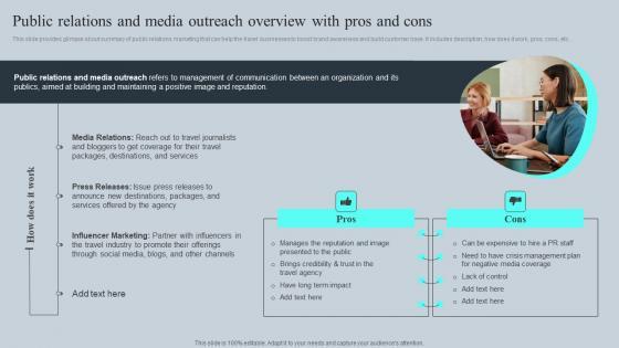 This slide provides glimpse about summary of public relations marketing that can help the travel businesses to boost brand awareness and build customer base. It includes description, how does it work, pros, cons, etc. Do you have an important presentation coming up Are you looking for something that will make your presentation stand out from the rest Look no further than Tour And Travel Agency Marketing Public Relations And Media Outreach Overview Portrait PDF. With our professional designs, you can trust that your presentation will pop and make delivering it a smooth process. And with Slidegeeks, you can trust that your presentation will be unique and memorable. So why wait Grab Tour And Travel Agency Marketing Public Relations And Media Outreach Overview Portrait PDF today and make your presentation stand out from the rest.