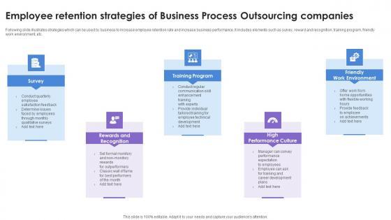 Following slide illustrates strategies which can be used by business to increase employee retention rate and increase business performance. It includes elements such as survey, reward and recognition, training program, friendly work environment, etc. Pitch your topic with ease and precision using this Employee Retention Strategies Of Business Process Outsourcing Companies Rules Pdf. This layout presents information on Survey, Training Program, High Performance Culture. It is also available for immediate download and adjustment. So, changes can be made in the color, design, graphics or any other component to create a unique layout. Following slide illustrates strategies which can be used by business to increase employee retention rate and increase business performance. It includes elements such as survey, reward and recognition, training program, friendly work environment, etc.