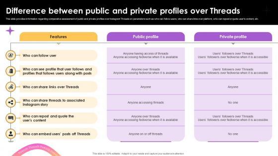 This slide provides information regarding comparative assessment of public and private profiles over Instagram Threads on parameters such as who can follow users, who can share links over platform, who can repost or quote users content, etc.There are so many reasons you need a Difference Between Public And Private Profiles Over Everything To Know About Instagram Threads AI SS V. The first reason is you can not spend time making everything from scratch, Thus, Slidegeeks has made presentation templates for you too. You can easily download these templates from our website easily. This slide provides information regarding comparative assessment of public and private profiles over Instagram Threads on parameters such as who can follow users, who can share links over platform, who can repost or quote users content, etc.