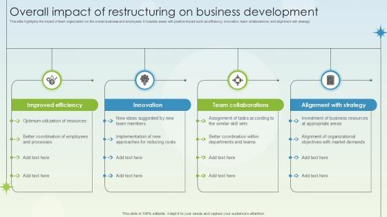 This slide highlights the impact of team organization on the overall business and employees. it includes areas with positive impact such as efficiency, innovation, team collaborations, and alignment with strategy Do you have to make sure that everyone on your team knows about any specific topic I yes, then you should give Overall Impact Of Restructuring On Business Development Business Growth Ppt Powerpoint a try. Our experts have put a lot of knowledge and effort into creating this impeccable Overall Impact Of Restructuring On Business Development Business Growth Ppt Powerpoint. You can use this template for your upcoming presentations, as the slides are perfect to represent even the tiniest detail. You can download these templates from the Slidegeeks website and these are easy to edit. So grab these today This slide highlights the impact of team organization on the overall business and employees. it includes areas with positive impact such as efficiency, innovation, team collaborations, and alignment with strategy