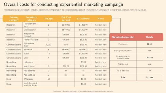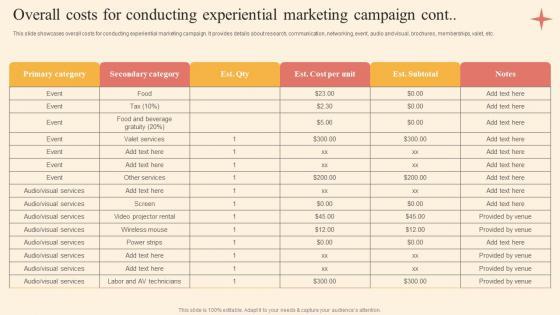 This slide showcases overall costs for conducting experiential marketing campaign. It provides details about research, communication, networking, event, audio and visual, brochures, memberships, valet, etc. Slidegeeks is here to make your presentations a breeze with Overall Costs For Conducting Driving Business Success By Hosting Experiential Structure Pdf With our easy to use and customizable templates, you can focus on delivering your ideas rather than worrying about formatting. With a variety of designs to choose from, you are sure to find one that suits your needs. And with animations and unique photos, illustrations, and fonts, you can make your presentation pop. So whether you are giving a sales pitch or presenting to the board, make sure to check out Slidegeeks first This slide showcases overall costs for conducting experiential marketing campaign. It provides details about research, communication, networking, event, audio and visual, brochures, memberships, valet, etc.