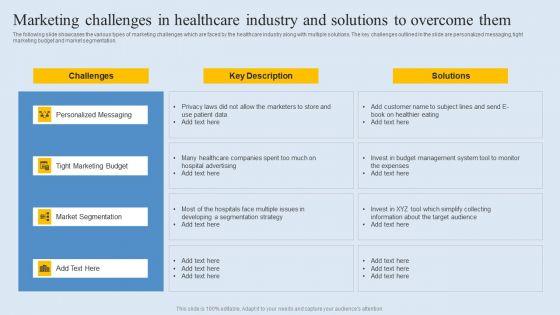 The following slide showcases the various types of marketing challenges which are faced by the healthcare industry along with multiple solutions. The key challenges outlined in the slide are personalized messaging, tight marketing budget and market segmentation. Here you can discover an assortment of the finest PowerPoint and Google Slides templates. With these templates, you can create presentations for a variety of purposes while simultaneously providing your audience with an eye catching visual experience. Download Marketing Challenges In Healthcare Industry And Solutions To Overcome Them Elements PDF to deliver an impeccable presentation. These templates will make your job of preparing presentations much quicker, yet still, maintain a high level of quality. Slidegeeks has experienced researchers who prepare these templates and write high quality content for you. Later on, you can personalize the content by editing the Marketing Challenges In Healthcare Industry And Solutions To Overcome Them Elements PDF.