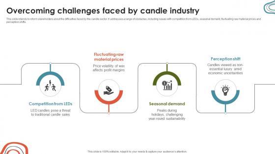 This slide intends to inform stakeholders about the difficulties faced by the candle sector. It addresses a range of obstacles, including issues with competition from LEDs, seasonal demand, fluctuating raw material prices and perception shifts. Are you searching for a Candle Business Venture Overcoming Challenges Faced By Candle Industry BP SS V that is uncluttered, straightforward, and original Its easy to edit, and you can change the colors to suit your personal or business branding. For a presentation that expresses how much effort you have put in, this template is ideal With all of its features, including tables, diagrams, statistics, and lists, its perfect for a business plan presentation. Make your ideas more appealing with these professional slides. Download Candle Business Venture Overcoming Challenges Faced By Candle Industry BP SS V from Slidegeeks today. This slide intends to inform stakeholders about the difficulties faced by the candle sector. It addresses a range of obstacles, including issues with competition from LEDs, seasonal demand, fluctuating raw material prices and perception shifts.