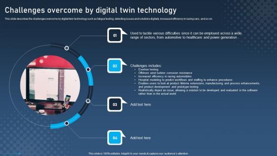 This slide describes the challenges overcome by digital twin technology such as fatigue testing, detecting issues and solutions digitally, increased efficiency in racing cars, and so on. From laying roadmaps to briefing everything in detail, our templates are perfect for you. You can set the stage with your presentation slides. All you have to do is download these easy-to-edit and customizable templates. Challenges Overcome By Digital Twin Technology Digital Twins For Enhanced Industrial Mockup Pdf will help you deliver an outstanding performance that everyone would remember and praise you for. Do download this presentation today. This slide describes the challenges overcome by digital twin technology such as fatigue testing, detecting issues and solutions digitally, increased efficiency in racing cars, and so on.