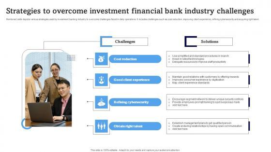 Mentioned slide depicts various strategies used by investment banking industry to overcome challenges faced in daily operations. It includes challenges such as cost reduction, improving client experience, refining cybersecurity and acquiring right talent. Showcasing this set of slides titled Strategies To Overcome Investment Financial Bank Industry Challenges Icons Pdf. The topics addressed in these templates are Cost Reduction, Good Client Experience, Refining Cybersecurity. All the content presented in this PPT design is completely editable. Download it and make adjustments in color, background, font etc. as per your unique business setting. Mentioned slide depicts various strategies used by investment banking industry to overcome challenges faced in daily operations. It includes challenges such as cost reduction, improving client experience, refining cybersecurity and acquiring right talent.