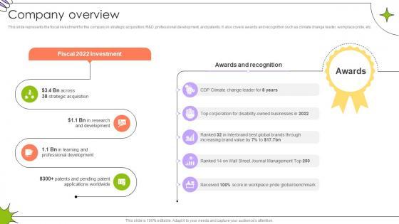 This slide represents the fiscal investment for the company in strategic acquisition, RandD, professional development, and patents. It also covers awards and recognition such as climate change leader, workplace pride, etc.Do you have to make sure that everyone on your team knows about any specific topic I yes, then you should give Company Overview Global Innovation And Business Solutions Company Profile CP SS V a try. Our experts have put a lot of knowledge and effort into creating this impeccable Company Overview Global Innovation And Business Solutions Company Profile CP SS V. You can use this template for your upcoming presentations, as the slides are perfect to represent even the tiniest detail. You can download these templates from the Slidegeeks website and these are easy to edit. So grab these today This slide represents the fiscal investment for the company in strategic acquisition, RandD, professional development, and patents. It also covers awards and recognition such as climate change leader, workplace pride, etc.