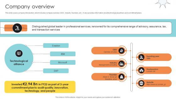 This slide covers company introduction, which includes company overview CEO, industry, founders, etc.. It also provides information about technological partners and commitment plans.Slidegeeks is one of the best resources for PowerPoint templates. You can download easily and regulate Company Overview Professional Services And Tax Advisory Company Profile CP SS V for your personal presentations from our wonderful collection. A few clicks is all it takes to discover and get the most relevant and appropriate templates. Use our Templates to add a unique zing and appeal to your presentation and meetings. All the slides are easy to edit and you can use them even for advertisement purposes. This slide covers company introduction, which includes company overview CEO, industry, founders, etc.. It also provides information about technological partners and commitment plans.