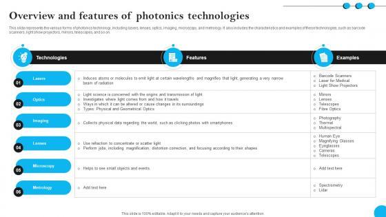 This slide represents the various forms of photonics technology, including lasers, lenses, optics, imaging, microscopy, and metrology. It also includes the characteristics and examples of these technologies, such as barcode scanners, light show projectors, mirrors, telescopes, and so on. This Fibers IT Overview And Features Of Photonics Technologies from Slidegeeks makes it easy to present information on your topic with precision. It provides customization options, so you can make changes to the colors, design, graphics, or any other component to create a unique layout. It is also available for immediate download, so you can begin using it right away. Slidegeeks has done good research to ensure that you have everything you need to make your presentation stand out. Make a name out there for a brilliant performance. This slide represents the various forms of photonics technology, including lasers, lenses, optics, imaging, microscopy, and metrology. It also includes the characteristics and examples of these technologies, such as barcode scanners, light show projectors, mirrors, telescopes, and so on.