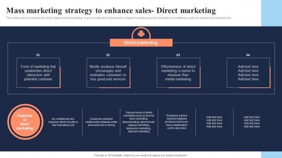 This slide covers a brief overview of the digital marketing strategy. It also provides the characteristics of direct marketing such as elimination of middlemen, customer oriented, direct channel etc. If your project calls for a presentation, then Slidegeeks is your go-to partner because we have professionally designed, easy-to-edit templates that are perfect for any presentation. After downloading, you can easily edit Mass Marketing Strategy To Enhance Sales Direct Marketing In Depth Overview Of Mass Mockup Pdf and make the changes accordingly. You can rearrange slides or fill them with different images. Check out all the handy templates This slide covers a brief overview of the digital marketing strategy. It also provides the characteristics of direct marketing such as elimination of middlemen, customer oriented, direct channel etc.