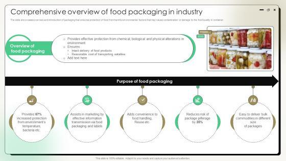 The slide showcases overview and introduction of packaging that ensures protection of food from harmful environmental factors that may cause contamination or damage to the food quality in container. There are so many reasons you need a Comprehensive Overview Of Food Packaging In Industry. The first reason is you can not spend time making everything from scratch, Thus, Slidegeeks has made presentation templates for you too. You can easily download these templates from our website easily. The slide showcases overview and introduction of packaging that ensures protection of food from harmful environmental factors that may cause contamination or damage to the food quality in container.