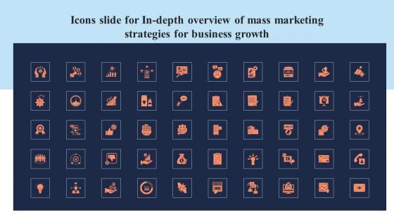 Introducing our well designed Icons Slide For In Depth Overview Of Mass Marketing Strategies For Business Growth Ideas Pdf set of slides. The slide displays editable icons to enhance your visual presentation. The icons can be edited easily. So customize according to your business to achieve a creative edge. Download and share it with your audience. Our Icons Slide For In Depth Overview Of Mass Marketing Strategies For Business Growth Ideas Pdf are topically designed to provide an attractive backdrop to any subject. Use them to look like a presentation pro.
