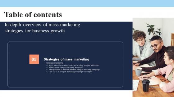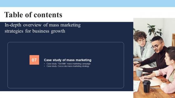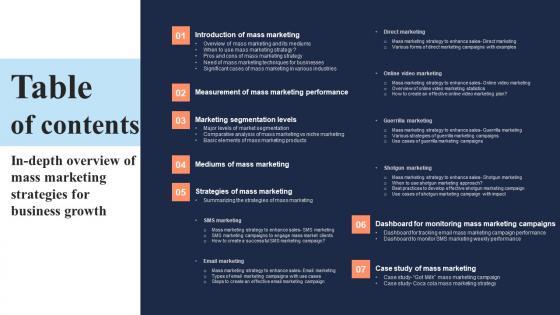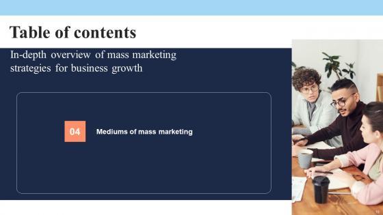 Retrieve professionally designed Table Of Contents In Depth Overview Of Mass Marketing Strategies For Business Growth Formats Pdf to effectively convey your message and captivate your listeners. Save time by selecting pre-made slideshows that are appropriate for various topics, from business to educational purposes. These themes come in many different styles, from creative to corporate, and all of them are easily adjustable and can be edited quickly. Access them as PowerPoint templates or as Google Slides themes. You do not have to go on a hunt for the perfect presentation because Slidegeeks got you covered from everywhere. Our Table Of Contents In Depth Overview Of Mass Marketing Strategies For Business Growth Formats Pdf are topically designed to provide an attractive backdrop to any subject. Use them to look like a presentation pro.