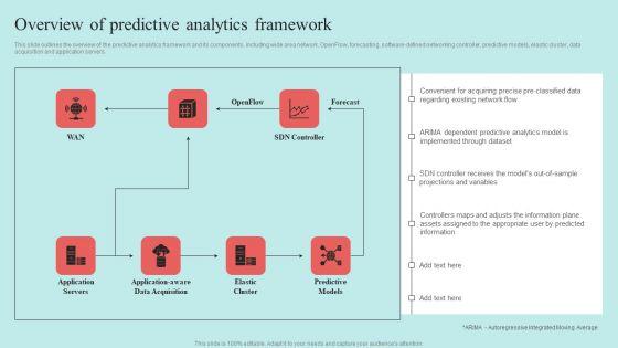 This slide outlines the overview of the predictive analytics framework and its components, including wide area network, OpenFlow, forecasting, software-defined networking controller, predictive models, elastic cluster, data acquisition and application servers. Find highly impressive Predictive Analytics For Empowering Overview Of Predictive Analytics Framework Mockup Pdf on Slidegeeks to deliver a meaningful presentation. You can save an ample amount of time using these presentation templates. No need to worry to prepare everything from scratch because Slidegeeks experts have already done a huge research and work for you. You need to download Predictive Analytics For Empowering Overview Of Predictive Analytics Framework Mockup Pdf for your upcoming presentation. All the presentation templates are 100 percent editable and you can change the color and personalize the content accordingly. Download now. This slide outlines the overview of the predictive analytics framework and its components, including wide area network, OpenFlow, forecasting, software-defined networking controller, predictive models, elastic cluster, data acquisition and application servers.
