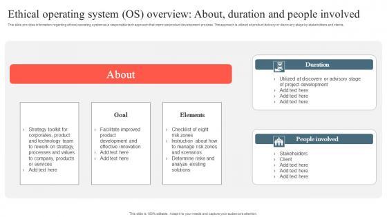 This slide provides information regarding ethical operating system as a responsible tech approach that improves product development process. The approach is utilized at product delivery or discovery stage by stakeholders and clients. Take your projects to the next level with our ultimate collection of Responsible Technology Playbook Ethical Operating System OS Overview About Duration Topics PDF. Slidegeeks has designed a range of layouts that are perfect for representing task or activity duration, keeping track of all your deadlines at a glance. Tailor these designs to your exact needs and give them a truly corporate look with your own brand colors theyll make your projects stand out from the rest.