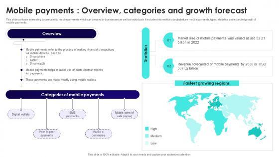 This slide contains interesting data related to mobile payments which can be used by businesses as well as individuals. It includes information about what are mobile payments, types, statistics and expected growth of mobile payments. Create an editable A10 Wireless Banking To Improve Mobile Payments Overview Categories Fin SS V that communicates your idea and engages your audience. Whether you are presenting a business or an educational presentation, pre-designed presentation templates help save time. A10 Wireless Banking To Improve Mobile Payments Overview Categories Fin SS V is highly customizable and very easy to edit, covering many different styles from creative to business presentations. Slidegeeks has creative team members who have crafted amazing templates. So, go and get them without any delay. This slide contains interesting data related to mobile payments which can be used by businesses as well as individuals. It includes information about what are mobile payments, types, statistics and expected growth of mobile payments.
