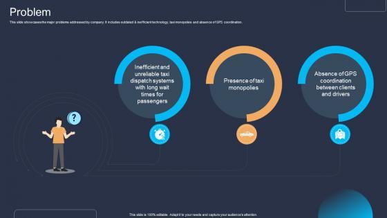 This slide showcases the major problems addressed by company. It includes outdated and inefficient technology, taxi monopolies and absence of GPS coordination. Find highly impressive Problem Platform As A Service Paas Business Model BMC SS V on Slidegeeks to deliver a meaningful presentation. You can save an ample amount of time using these presentation templates. No need to worry to prepare everything from scratch because Slidegeeks experts have already done a huge research and work for you. You need to download Problem Platform As A Service Paas Business Model BMC SS V for your upcoming presentation. All the presentation templates are 100 percent editable and you can change the color and personalize the content accordingly. Download now This slide showcases the major problems addressed by company. It includes outdated and inefficient technology, taxi monopolies and absence of GPS coordination.