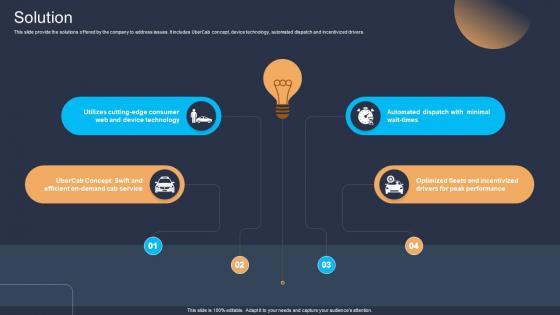 This slide provide the solutions offered by the company to address issues. It includes UberCab concept, device technology, automated dispatch and incentivized drivers. If you are looking for a format to display your unique thoughts, then the professionally designed Solution Platform As A Service Paas Business Model BMC SS V is the one for you. You can use it as a Google Slides template or a PowerPoint template. Incorporate impressive visuals, symbols, images, and other charts. Modify or reorganize the text boxes as you desire. Experiment with shade schemes and font pairings. Alter, share or cooperate with other people on your work. Download Solution Platform As A Service Paas Business Model BMC SS V and find out how to give a successful presentation. Present a perfect display to your team and make your presentation unforgettable. This slide provide the solutions offered by the company to address issues. It includes UberCab concept, device technology, automated dispatch and incentivized drivers.