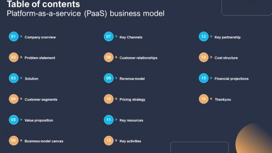 Are you in need of a template that can accommodate all of your creative concepts This one is crafted professionally and can be altered to fit any style. Use it with Google Slides or PowerPoint. Include striking photographs, symbols, depictions, and other visuals. Fill, move around, or remove text boxes as desired. Test out color palettes and font mixtures. Edit and save your work, or work with colleagues. Download Table Of Contents Platform As A Service Paas Business Model BMC SS V and observe how to make your presentation outstanding. Give an impeccable presentation to your group and make your presentation unforgettable. Our Table Of Contents Platform As A Service Paas Business Model BMC SS V are topically designed to provide an attractive backdrop to any subject. Use them to look like a presentation pro.