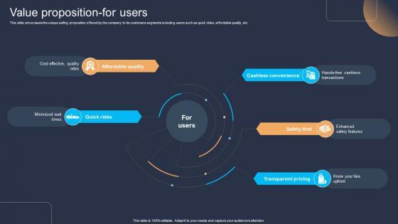 This slide showcases the unique selling proposition offered by the company to its customers segments including users such as quick rides, affordable quality, etc. Make sure to capture your audiences attention in your business displays with our gratis customizable Value Proposition For Users Platform As A Service Paas Business Model BMC SS V. These are great for business strategies, office conferences, capital raising or task suggestions. If you desire to acquire more customers for your tech business and ensure they stay satisfied, create your own sales presentation with these plain slides. This slide showcases the unique selling proposition offered by the company to its customers segments including users such as quick rides, affordable quality, etc.