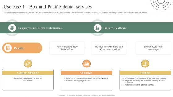 This slide displays case study of box cloud service implementation on pacific dental services. It further includes company name, industry, objective, challenges faced, solutions implemented and results. If your project calls for a presentation, then Slidegeeks is your go-to partner because we have professionally designed, easy-to-edit templates that are perfect for any presentation. After downloading, you can easily edit Use Case 1 Box And Pacific Dental Services Ultimate Guide To Adopt Box Topics PDF and make the changes accordingly. You can rearrange slides or fill them with different images. Check out all the handy templates This slide displays case study of box cloud service implementation on pacific dental services. It further includes company name, industry, objective, challenges faced, solutions implemented and results.