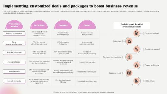 This slide defines promotional bundle and various types available to businesses. It also includes tools to select the right promotional bundle such as customer feedback, sales data, competitor research, customer segmentation, product profitability and seasonal trends. Take your projects to the next level with our ultimate collection of Salon Marketing Plan To Optimize Implementing Customized Deals And Packages Strategy SS V. Slidegeeks has designed a range of layouts that are perfect for representing task or activity duration, keeping track of all your deadlines at a glance. Tailor these designs to your exact needs and give them a truly corporate look with your own brand colors they will make your projects stand out from the rest This slide defines promotional bundle and various types available to businesses. It also includes tools to select the right promotional bundle such as customer feedback, sales data, competitor research, customer segmentation, product profitability and seasonal trends.