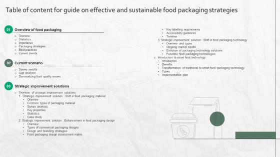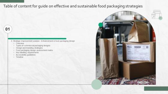 Whether you have daily or monthly meetings, a brilliant presentation is necessary. Table Of Content For Guide On Effective And Sustainable Food Packaging Strategies can be your best option for delivering a presentation. Represent everything in detail using Table Of Content For Guide On Effective And Sustainable Food Packaging Strategies and make yourself stand out in meetings. The template is versatile and follows a structure that will cater to your requirements. All the templates prepared by Slidegeeks are easy to download and edit. Our research experts have taken care of the corporate themes as well. So, give it a try and see the results. Our Table Of Content For Guide On Effective And Sustainable Food Packaging Strategies are topically designed to provide an attractive backdrop to any subject. Use them to look like a presentation pro.