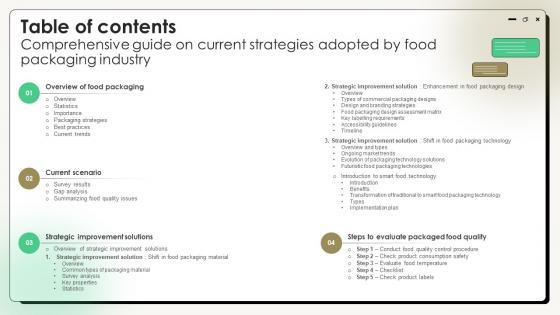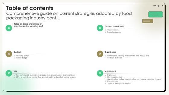Get a simple yet stunning designed Table Of Contents Comprehensive Guide On Current Strategies Adopted By Food Packaging Industry. It is the best one to establish the tone in your meetings. It is an excellent way to make your presentations highly effective. So, download this PPT today from Slidegeeks and see the positive impacts. Our easy-to-edit Table Of Contents Comprehensive Guide On Current Strategies Adopted By Food Packaging Industry can be your go-to option for all upcoming conferences and meetings. So, what are you waiting for Grab this template today. Our Table Of Contents Comprehensive Guide On Current Strategies Adopted By Food Packaging Industry are topically designed to provide an attractive backdrop to any subject. Use them to look like a presentation pro.