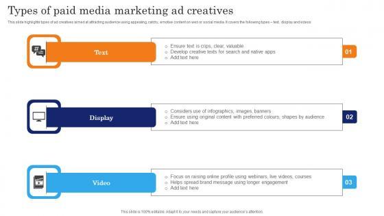This slide highlights types of ad creatives aimed at attracting audience using appealing, catchy, emotive content on web or social media. It covers the following types text, display and videos Pitch your topic with ease and precision using this Types Of Paid Media Marketing Ad Creatives Information Pdf. This layout presents information on Text, Display, Video. It is also available for immediate download and adjustment. So, changes can be made in the color, design, graphics or any other component to create a unique layout. This slide highlights types of ad creatives aimed at attracting audience using appealing, catchy, emotive content on web or social media. It covers the following types text, display and videos