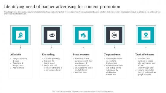 This slide provides glimpse about requirement and benefits of banner advertising which involves placement of rectangular ads on top, side or bottom of others website. It includes benefits such as affordable, eye catching, brand awareness, target audience, etc. If your project calls for a presentation, then Slidegeeks is your go to partner because we have professionally designed, easy to edit templates that are perfect for any presentation. After downloading, you can easily edit Identifying Need Of Banner Paid Media Advertising For Optimizing Customer Diagrams Pdf and make the changes accordingly. You can rearrange slides or fill them with different images. Check out all the handy templates This slide provides glimpse about requirement and benefits of banner advertising which involves placement of rectangular ads on top, side or bottom of others website. It includes benefits such as affordable, eye catching, brand awareness, target audience, etc.