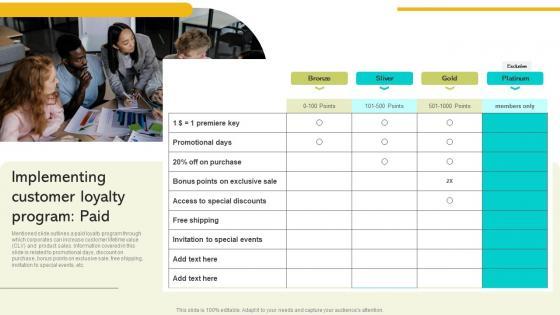 Mentioned slide outlines a paid loyalty program through which corporates can increase customer lifetime value CLV and product sales. Information covered in this slide is related to promotional days, discount on purchase, bonus points on exclusive sale, free shipping, invitation to special events, etc. Crafting an eye catching presentation has never been more straightforward. Let your presentation shine with this tasteful yet straightforward Implementing Customer Loyalty Program Paid Formats PDF template. It offers a minimalistic and classy look that is great for making a statement. The colors have been employed intelligently to add a bit of playfulness while still remaining professional. Construct the ideal Implementing Customer Loyalty Program Paid Formats PDF that effortlessly grabs the attention of your audience. Begin now and be certain to wow your customers.