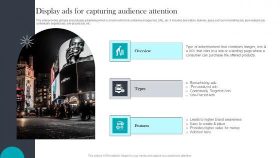 This slide provides glimpse about display advertising which is a hybrid ad format containing images, text, URL, etc. It includes description, features, types such as remarketing ads, personalized ads, contextually targeted ads, site-placed ads, etc. Want to ace your presentation in front of a live audience Our Execution Of Effective Paid Media Advertising Strategies Display Ads For Capturing Audience Attention Sample PDF can help you do that by engaging all the users towards you. Slidegeeks experts have put their efforts and expertise into creating these impeccable powerpoint presentations so that you can communicate your ideas clearly. Moreover, all the templates are customizable, and easy to edit and downloadable. Use these for both personal and commercial use.