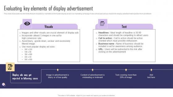 This slide showcases key elements that are included by marketers to formulate display ad and run marketing campaign. It also showcase various reasons for display advertisement rejection from ad network. Crafting an eye-catching presentation has never been more straightforward. Let your presentation shine with this tasteful yet straightforward Evaluating Key Elements Of Display Advertisement Paid Internet Marketing Strategy Clipart Pdf template. It offers a minimalistic and classy look that is great for making a statement. The colors have been employed intelligently to add a bit of playfulness while still remaining professional. Construct the ideal Evaluating Key Elements Of Display Advertisement Paid Internet Marketing Strategy Clipart Pdf that effortlessly grabs the attention of your audience. Begin now and be certain to wow your customers. This slide showcases key elements that are included by marketers to formulate display ad and run marketing campaign. It also showcase various reasons for display advertisement rejection from ad network.