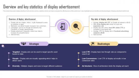 This slide showcases display advertisement overview and key statistics which can help to evaluate the effectiveness of this ad format. It also highlight various benefits and disadvantages of display advertisement format. Retrieve professionally designed Overview And Key Statistics Of Display Advertisement Paid Internet Marketing Strategy Portrait Pdf to effectively convey your message and captivate your listeners. Save time by selecting pre-made slideshows that are appropriate for various topics, from business to educational purposes. These themes come in many different styles, from creative to corporate, and all of them are easily adjustable and can be edited quickly. Access them as PowerPoint templates or as Google Slides themes. You do not have to go on a hunt for the perfect presentation because Slidegeeks got you covered from everywhere. This slide showcases display advertisement overview and key statistics which can help to evaluate the effectiveness of this ad format. It also highlight various benefits and disadvantages of display advertisement format.