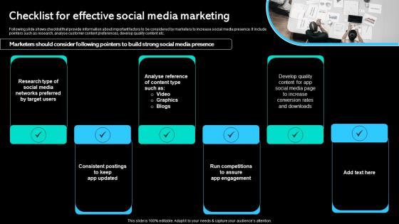 Following slide shows checklist that provide information about important factors to be considered by marketers to increase social media presence. It include pointers such as research, analyse customer content preferences, develop quality content etc. Whether you have daily or monthly meetings, a brilliant presentation is necessary. Checklist For Effective Social Media Marketing Paid Marketing Approach Graphics Pdf can be your best option for delivering a presentation. Represent everything in detail using Checklist For Effective Social Media Marketing Paid Marketing Approach Graphics Pdf and make yourself stand out in meetings. The template is versatile and follows a structure that will cater to your requirements. All the templates prepared by Slidegeeks are easy to download and edit. Our research experts have taken care of the corporate themes as well. So, give it a try and see the results. Following slide shows checklist that provide information about important factors to be considered by marketers to increase social media presence. It include pointers such as research, analyse customer content preferences, develop quality content etc.