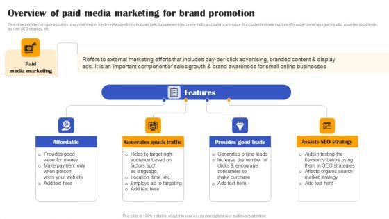 This slide provides glimpse about summary overview of paid media advertising that can help businesses to increase traffic and build brand value. It includes features such as affordable, generates quick traffic, provides good leads, assists SEO strategy, etc. Formulating a presentation can take up a lot of effort and time, so the content and message should always be the primary focus. The visuals of the PowerPoint can enhance the presenters message, so our Execution Of Effective Paid Media Advertising Strategies Overview Of Paid Media Marketing For Brand Promotion Ideas PDF was created to help save time. Instead of worrying about the design, the presenter can concentrate on the message while our designers work on creating the ideal templates for whatever situation is needed. Slidegeeks has experts for everything from amazing designs to valuable content, we have put everything into Execution Of Effective Paid Media Advertising Strategies Overview Of Paid Media Marketing For Brand Promotion Ideas PDF