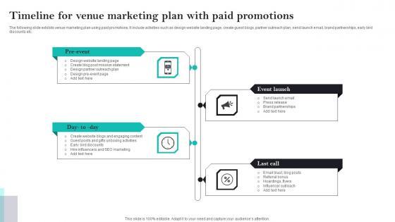 The following slide exhibits venue marketing plan using paid promotions. It include activities such as design website landing page, create guest blogs, partner outreach plan, send launch email, brand partnerships, early bird discounts etc. Showcasing this set of slides titled Timeline For Venue Marketing Plan With Paid Promotions Pictures Pdf. The topics addressed in these templates are Event Launch, Last Call, Pre Event. All the content presented in this PPT design is completely editable. Download it and make adjustments in color, background, font etc. as per your unique business setting. The following slide exhibits venue marketing plan using paid promotions. It include activities such as design website landing page, create guest blogs, partner outreach plan, send launch email, brand partnerships, early bird discounts etc.