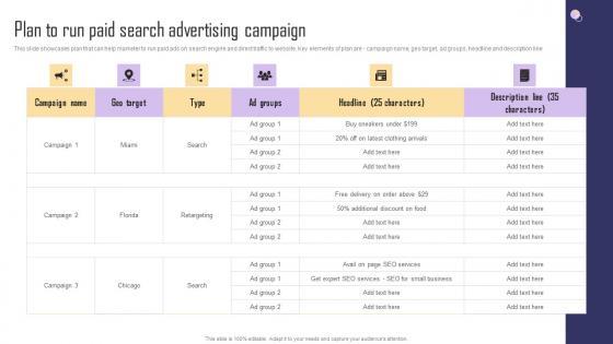 This slide showcases plan that can help organization to run paid online search engine ads and increase sales of products or services by ranking contact organically. Its key elements are campaign name, geo target, type, ad groups, headline and description line. If your project calls for a presentation, then Slidegeeks is your go to partner because we have professionally designed, easy to edit templates that are perfect for any presentation. After downloading, you can easily edit Plan To Run Paid Online Search Engine Advertisement Sample PDF and make the changes accordingly. You can rearrange slides or fill them with different images. Check out all the handy templates.