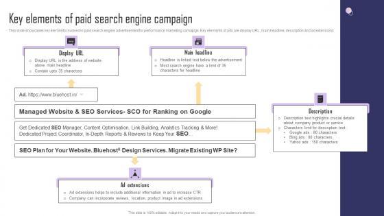 This slide showcases key elements involved in paid search engine advertisement for performance marketing camapign. Key elements of ads are display URL, main headline, description and ad extensions. Are you searching for a Strategic Performance Marketing Campaign Key Elements Of Paid Search Engine Structure Pdf that is uncluttered, straightforward, and original It is easy to edit, and you can change the colors to suit your personal or business branding. For a presentation that expresses how much effort you have put in, this template is ideal With all of its features, including tables, diagrams, statistics, and lists, it is perfect for a business plan presentation. Make your ideas more appealing with these professional slides. Download Strategic Performance Marketing Campaign Key Elements Of Paid Search Engine Structure Pdf from Slidegeeks today. This slide showcases key elements involved in paid search engine advertisement for performance marketing camapign. Key elements of ads are display URL, main headline, description and ad extensions.