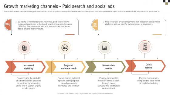 This slide showcases the impact of using paid search and social ads as growth marketing channels to achieve business goals. It provides implementation impact such as increased visibility, improved reach, quick result, etc. Slidegeeks has constructed Growth Marketing Channels Paid Search And Social Ads Best Practices For Using MKT SS V after conducting extensive research and examination. These presentation templates are constantly being generated and modified based on user preferences and critiques from editors. Here, you will find the most attractive templates for a range of purposes while taking into account ratings and remarks from users regarding the content. This is an excellent jumping-off point to explore our content and will give new users an insight into our top-notch PowerPoint Templates. This slide showcases the impact of using paid search and social ads as growth marketing channels to achieve business goals. It provides implementation impact such as increased visibility, improved reach, quick result, etc.