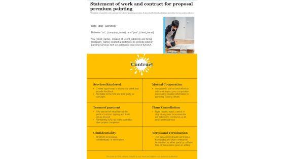 Presenting you an exemplary Statement Of Work And Contract For Proposal Premium Painting One Pager Sample Example Document. Our one-pager comprises all the must-have essentials of an inclusive document. You can edit it with ease, as its layout is completely editable. With such freedom, you can tweak its design and other elements to your requirements. Download this Statement Of Work And Contract For Proposal Premium Painting One Pager Sample Example Document brilliant piece now. Our Statement Of Work And Contract For Proposal Premium Painting One Pager Sample Example Document are topically designed to provide an attractive backdrop to any subject. Use them to look like a presentation pro.