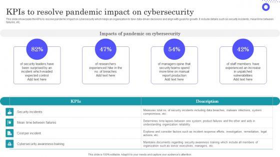 Pitch your topic with ease and precision using this KPIs To Resolve Pandemic Impact On Cybersecurity Microsoft Pdf This layout presents information on Understanding Organization, Security Incidents, Malware Infections It is also available for immediate download and adjustment. So, changes can be made in the color, design, graphics or any other component to create a unique layout. This slide showcases the KPIs to resolve pandemic impact on cybersecurity which helps an organization to take data driven decisions and align with goals for growth. It include details such as security incidents, mean time between failures, etc.