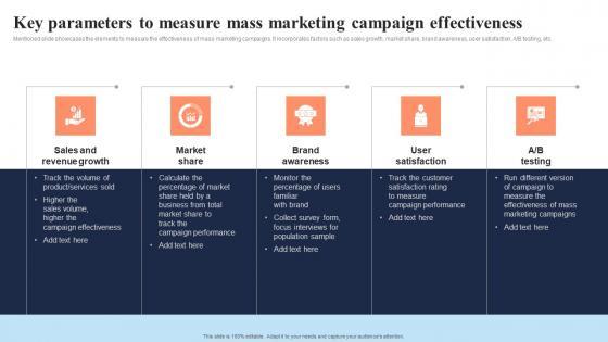 Mentioned slide showcases the elements to measure the effectiveness of mass marketing campaigns. It incorporates factors such as sales growth, market share, brand awareness, user satisfaction, A or B testing, etc. Do you have an important presentation coming up Are you looking for something that will make your presentation stand out from the rest Look no further than Key Parameters To Measure Mass Marketing Campaign In Depth Overview Of Mass Formats Pdf With our professional designs, you can trust that your presentation will pop and make delivering it a smooth process. And with Slidegeeks, you can trust that your presentation will be unique and memorable. So why wait Grab Key Parameters To Measure Mass Marketing Campaign In Depth Overview Of Mass Formats Pdf today and make your presentation stand out from the rest. Mentioned slide showcases the elements to measure the effectiveness of mass marketing campaigns. It incorporates factors such as sales growth, market share, brand awareness, user satisfaction, A or B testing, etc.