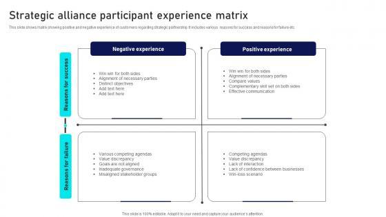 This slide shows matrix showing positive and negative experience of customers regarding strategic partnership. It includes various reasons for success and reasons for failure etc. Showcasing this set of slides titled Strategic Alliance Participant Experience Matrix Formats Pdf. The topics addressed in these templates are Reasons For Success, Reasons For Failure, Negative Experience. All the content presented in this PPT design is completely editable. Download it and make adjustments in color, background, font etc. as per your unique business setting. This slide shows matrix showing positive and negative experience of customers regarding strategic partnership. It includes various reasons for success and reasons for failure etc.